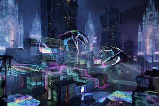 Cathedrals of code rise in the neon fog, their spires piercing the accelerationist sky, only to crack under the weight of unseen saboteurs.