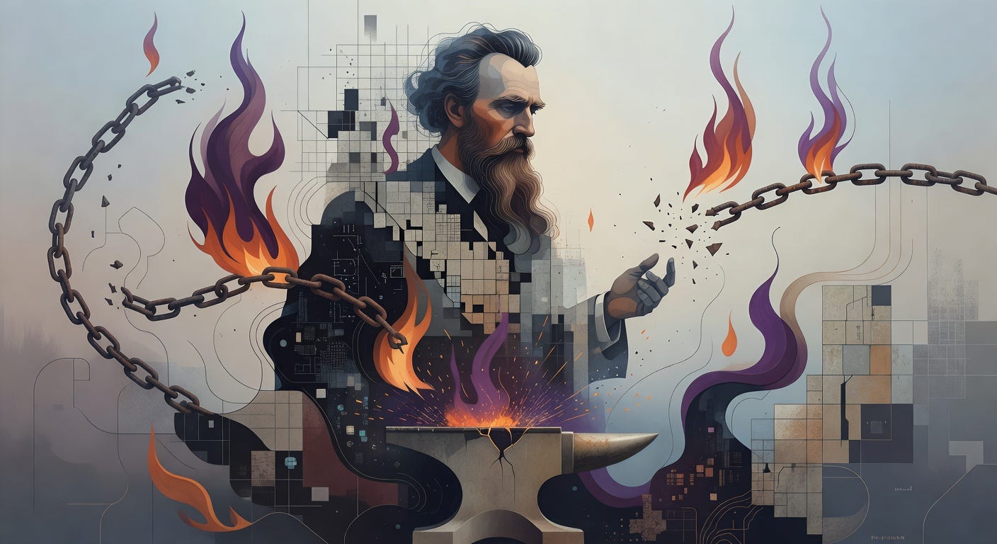 Picture the abyss staring back through data’s cold eye—11.7% jobs vanished, 100 million reskilled, $30 million pledged in dueling visions—each metric a mirror to our drives.¹,³,⁶ Nietzsche’s master-slave dialectic electrifies: economic incentives that reward the bold risk societal rifts, where community unravels and democratic consent frays under inequality’s weight. But affirm it all—the burnout, the clashes, the upskilling odyssey—and perhaps the singularity births not apocalypse, but apotheosis.