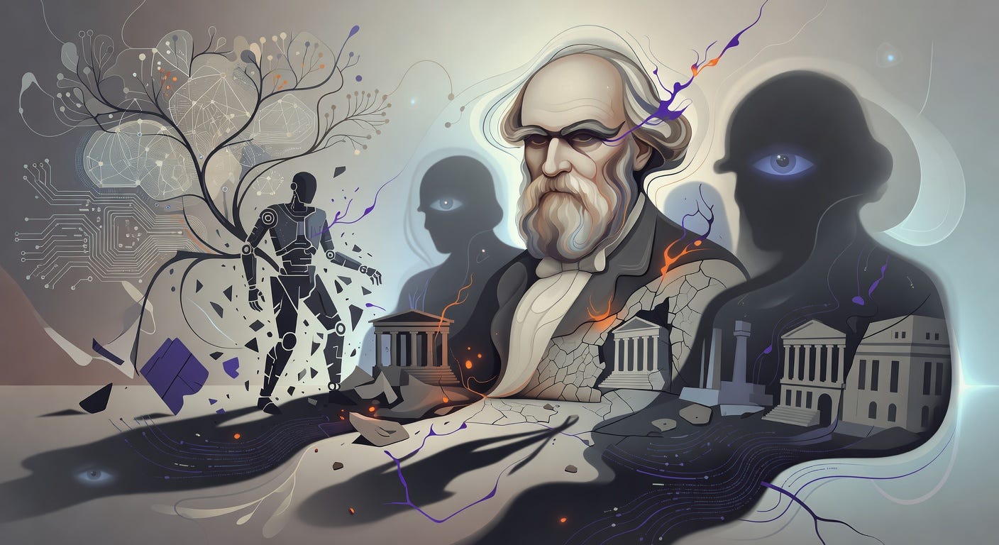 As coral polyps build reefs only to be battered by storms, so too do UN pleas for “inclusivity, accountability and human rights” form fragile barriers against AI’s tempests, warns High Commissioner Volker Türk, who cautions that without impact assessments, harms like disinformation and misogyny will polarize societies and undermine democratic institutions.² Darwin’s principle of struggle illuminates this: AI’s power dynamics select for the fit—those with data dominance thrive, while marginalized variants face extinction through social exclusion. Economically, this variation in access widens wealth chasms; innovation incentives favor concentrated markets, displacing laborers without retraining paths, unlike industrial automation’s mechanical substitutions. Societally, mental health frays as cultural shifts alienate the unskilled, community cohesion dissolves in echo chambers of bias-amplified division. Democratically, voter manipulation via polarized information erodes consent of the governed, rendering representation a vestigial organ in the body politic—do we adapt our institutions, or do they select against us?