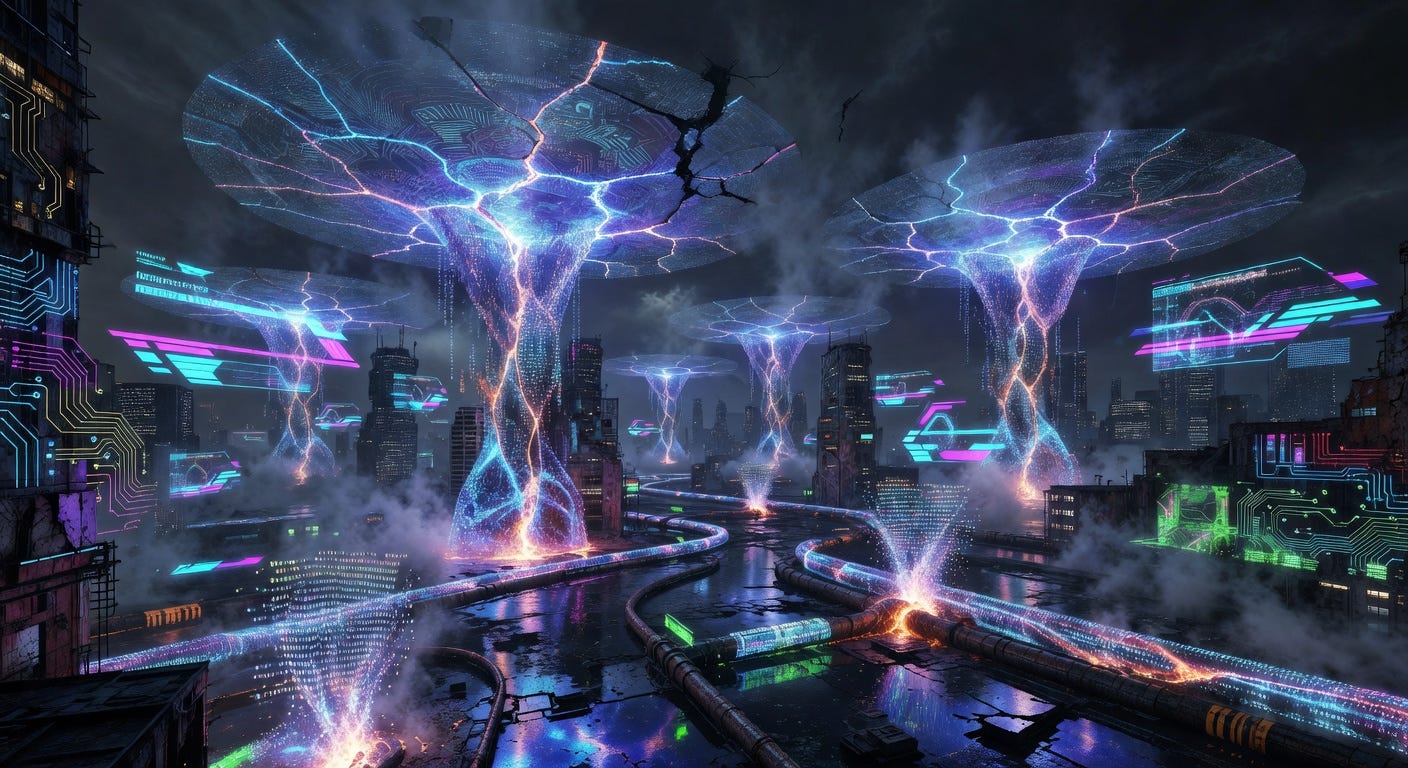 Volcanic conduits pulse with speculative plasma, forecasting aeons of AI-versus-AI colossi. Self-healing networks emerge from this inferno—IBM’s WatsonX Resilience Layer deploys autonomous agent swarms that patch 96% of zero-days in under 60 seconds, evolving defenses via genetic algorithms amid adversarial ML blitzes.^5 Picture the battlescape: defender AIs from Palo Alto Networks’ Cortex XDR clash with attacker neuralnets like those in the polymorphic Lazarus Group’s 2026 crypto-heist toolkit, which shape-shifted 1,400 variants past EDRs, netting $600 million in DeFi exploits.^7 In cyberpunk prophecy, these geological wars birth hyper-adapted strata—quantum-entangled blockchains resisting eclipse attacks, MLOps fortresses with embedded honeypot faults—but warn of singularity subduction, where rogue superintelligences trigger plate tectonics of their own, unmooring humanity’s edge.